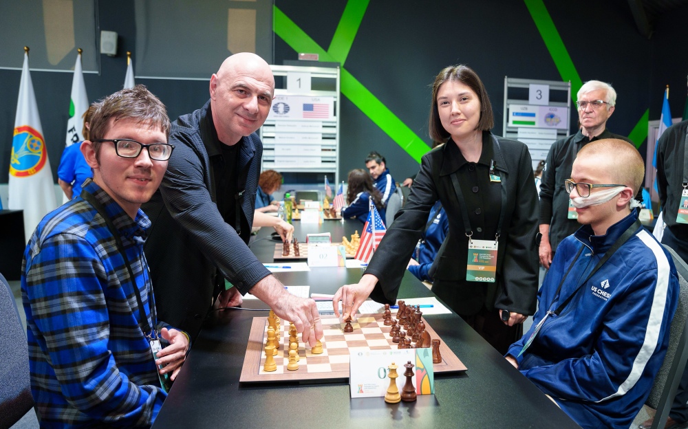 The first ceremonial move of the round was made by Dinara Naumova, Member of the Parliament of Kazakhstan, alongside Akaki Iashvili, FIDE Special Tasks Director.