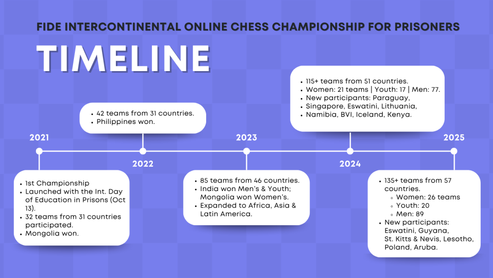 The 5th FIDE Intercontinental Online Chess Championship for Prisoners will take place from October 14 to 16, 2025, uniting incarcerated men, women, and youth from around the world through the game of chess.
