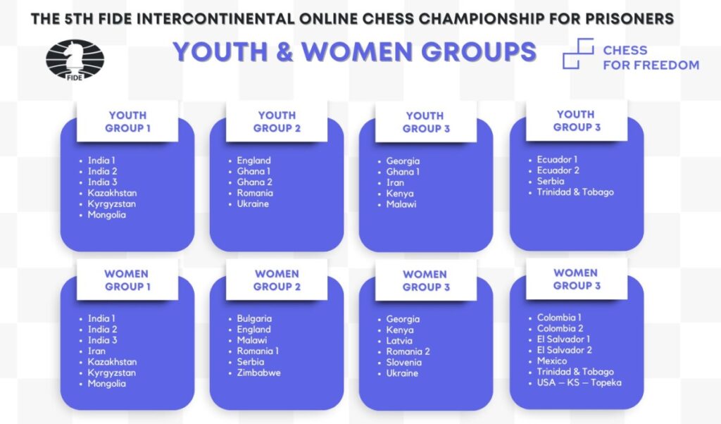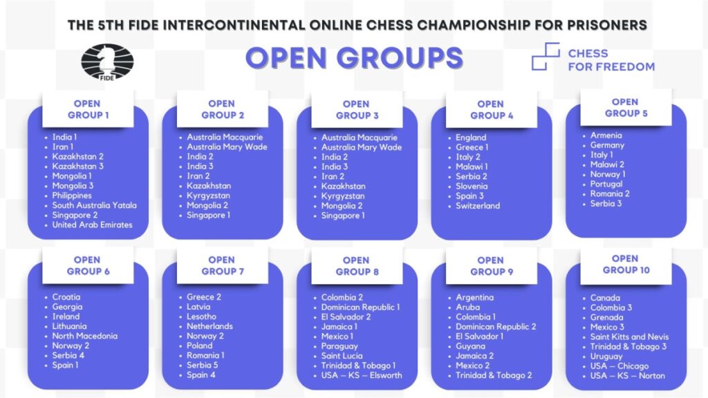 Each team has four currently incarcerated players. All games will be played on Chess.com with a 10+5 time control, supervised by official FIDE arbiters to ensure fair play.
