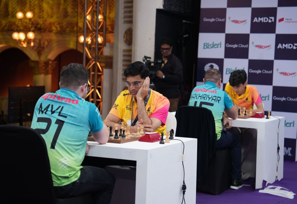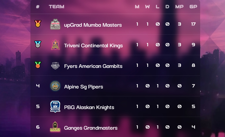 The defending champions, Triveni Continental Kings, began their title defense with a hard-earned victory. The home team, upGrad Mumbai Masters, delivered a dominant performance against the young Ganges Grandmasters. In the final match of the night, Fyers American Gambits edged past PBG Alaskan Knights in a close contest decided by just one game.