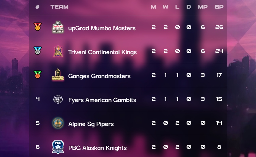 Fyers American Gambits defeated Triveni by 10–8 in a thrilling encounter decided on the prodigy board. At the same time, Alpine SG Pipers claimed their first win of the season, beating upGrad Mumbai Masters 9–7. Earlier in the day, Ganges Grandmasters dominated PBG Alaskan Knights with a convincing 12–3 victory.