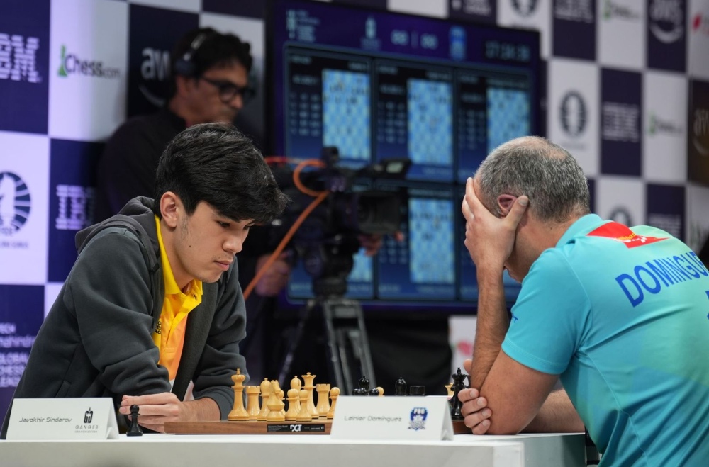 The prodigy board opened with a calm draw between Daniel Dardha and Raunak Sadhwani. The real breakthrough came when Javokhir Sindarov defeated Leinier Dominguez after a costly middlegame mistake.